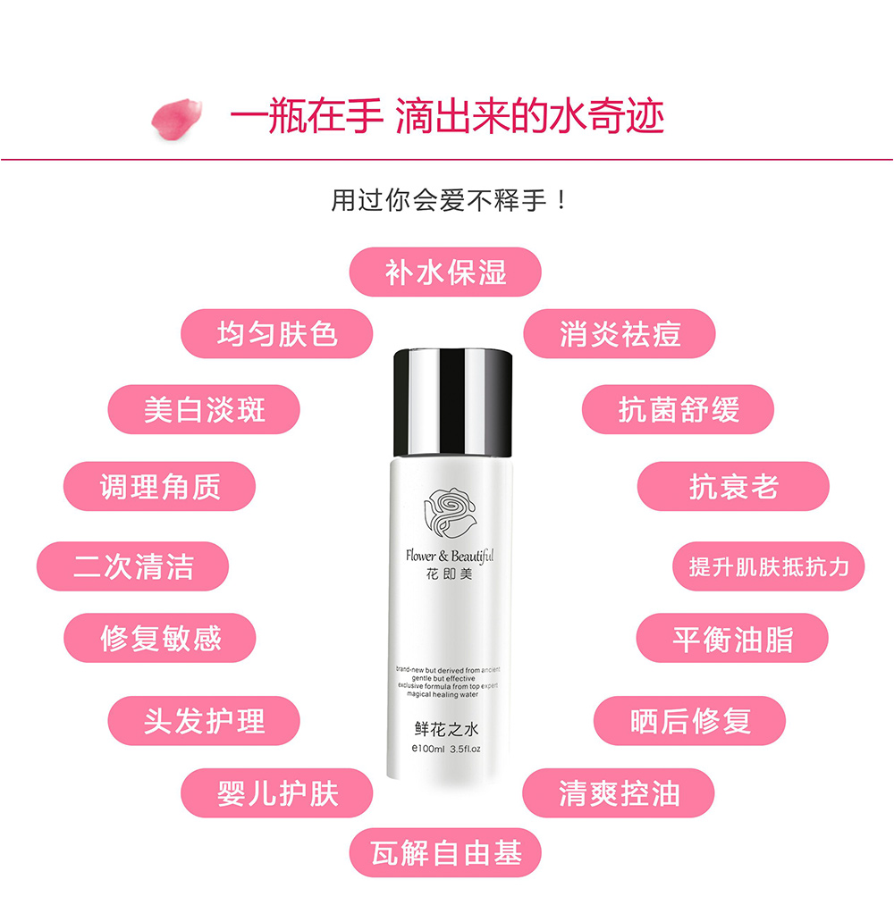 一般的爽肤水或者纯露,存在酒精、香精、化学防腐和各种对肌肤刺激的添加剂,长期使用,肌肤受到刺激过度,变得脆弱,敏感,粗糙……据有关专家组调查:80%的女性皮肤呈现亚健康状态,90%的化妆水含有刺激性添加剂。所以我们研发了这款神奇的花朵植物能量水, 它安全到可以直接口服都没问题!其中蕴含珍贵的保加利亚玫瑰纯露,能够补水保湿,淡化黑色素,淡化痘印,使肌肤净透白皙,清洁细致毛孔;特别添加澳洲当地特有的植物,卡卡杜李,它是世界上维他命C最丰富的来源,抗氧化效能媲美蓝莓、绿茶,而且能充盈修复皮肤细胞,从而具有很好的抗衰老功效;库拉索芦荟能有效消除痘痘炎症,治愈皮肤发红发痒的症状,逐渐改善敏感肌肤恢复健康皮脂膜,还可以作为晒后修护,坚持使用,让肌肤呈现光泽水嫩。
